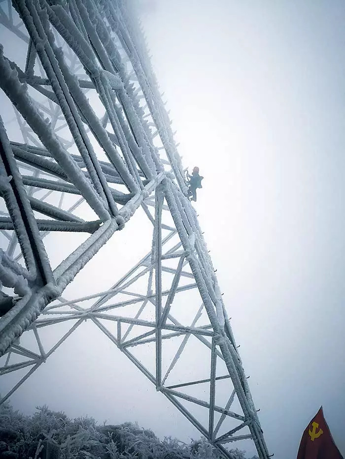 Repairman Chen Changsheng of a gird company in Zunyi, Guizhou province, took two hours to climb high to fix the transmission line damaged by low temperate and tough weather. “It’s our duty,” he said.