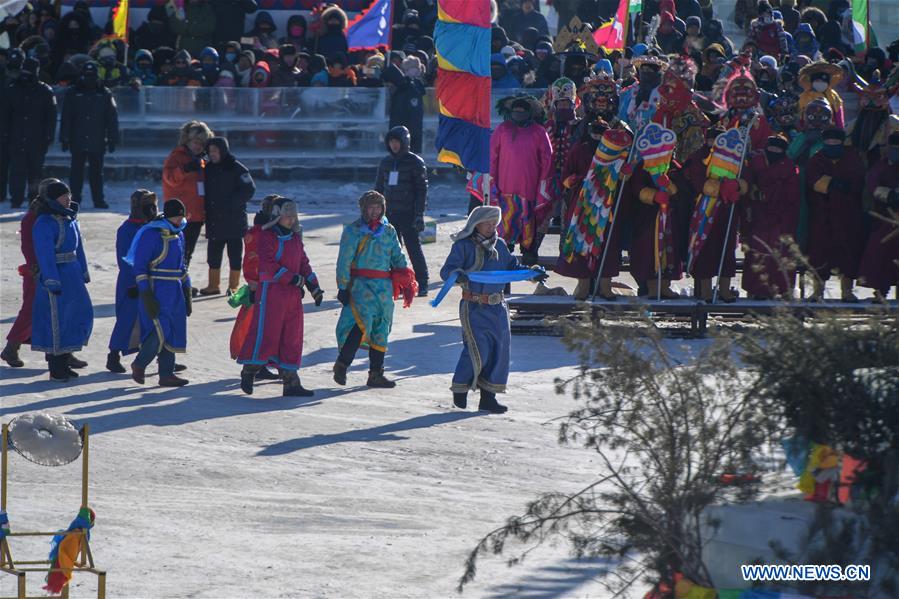 A sacrifice ceremony is held before a winter fishing event on the Chagan Lake in Songyuan City, northeast China's Jilin Province, Dec. 28, 2018. Winter fishing on ice-covered Chagan Lake dates back to the Liao and Jin dynasties from 10th century to the 13th century. (Xinhua/Zhang Nan)