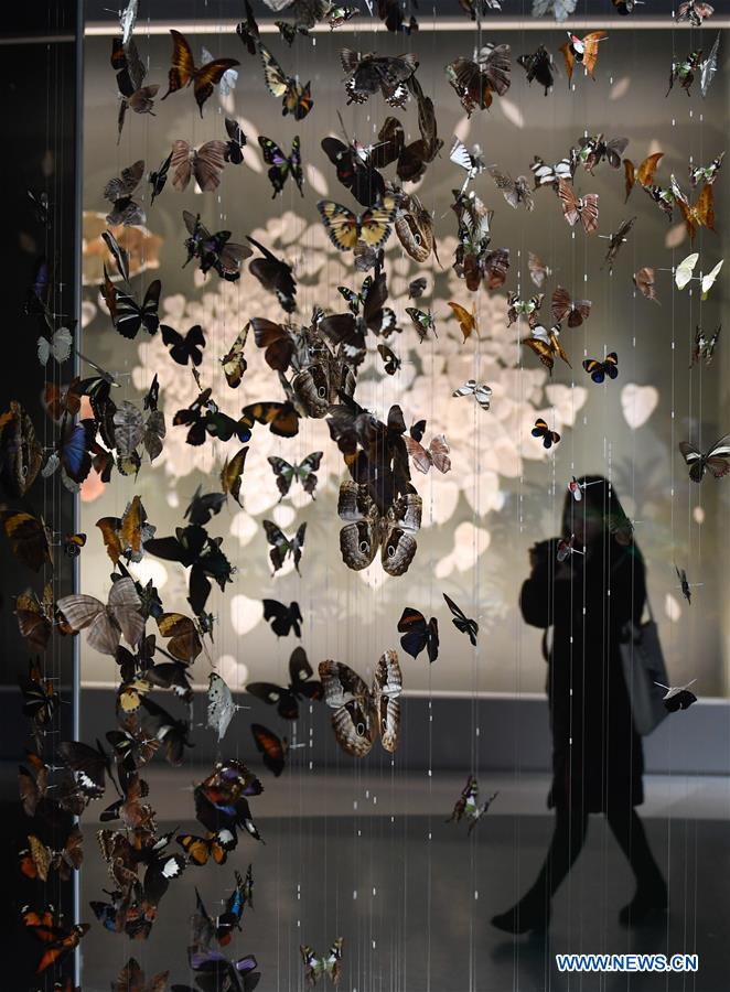 A visitor walks by butterfly samples at the Natural Art Hall at Anji Branch of Zhejiang Natural History Museum in Anji, east China's Zhejiang Province, on Dec. 28, 2018. The Anji Branch of Zhejiang Natural History Museum covering an area of more than 200,000 square meters started its test run on Friday. (Xinhua/Huang Zongzhi)
