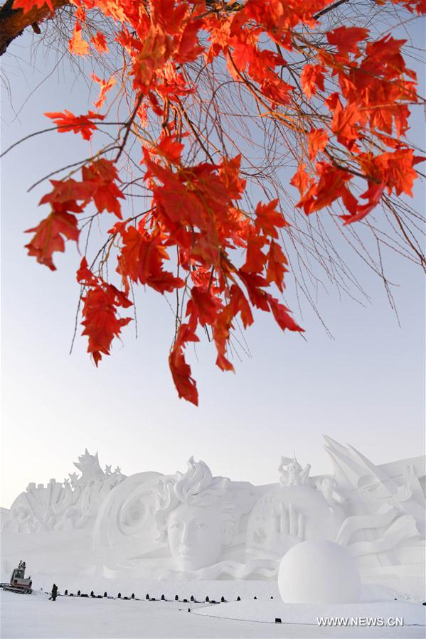 Photo taken on Dec. 28, 2018 shows the main snow sculpture at the Sun Island International Snow Sculpture Art Expo park in Harbin, northeast China's Heilongjiang Province. The main snow sculpture is 106 meters long, 32 meters high and 20 meters wide, using 40,000 cubic meters of snow. (Xinhua/Wang Song)