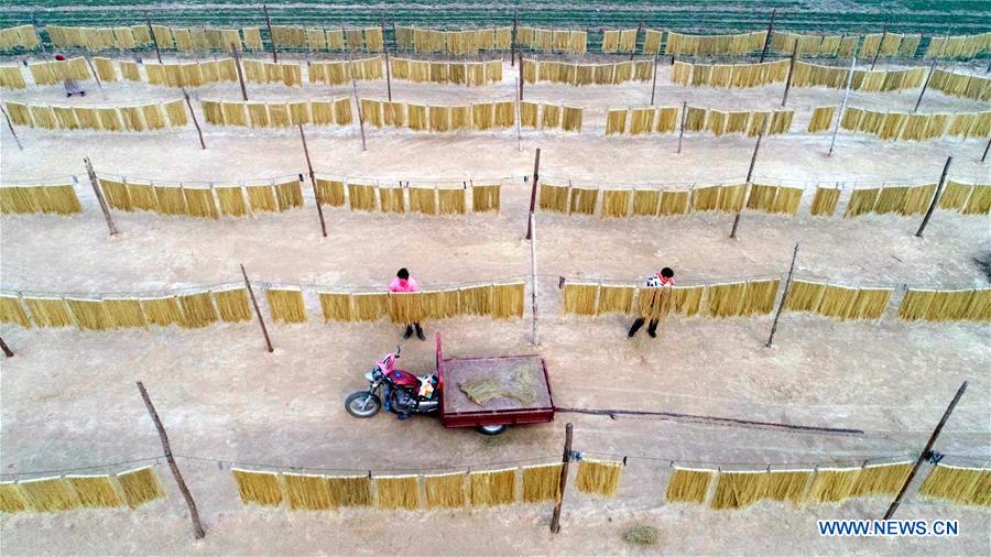 Farmers dry vermicelli in Guozhuang Village, Yanggu County, east China's Shandong Province, Jan. 7, 2019. Farmers in Guozhuang Village of Yanggu County are busy processing vermicelli to satisfy market demand as the Spring Festival approaches. (Xinhua)