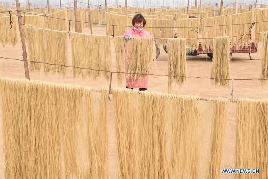 A farmer dries vermicelli in Guozhuang Village, Yanggu County, east China's Shandong Province, Jan. 7, 2019. Farmers in Guozhuang Village of Yanggu County are busy processing vermicelli to satisfy market demand as the Spring Festival approaches. (Xinhua)