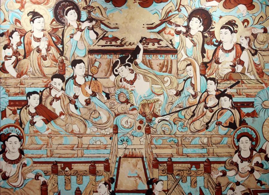 An oil painting by a Russian artist features a figure in the center playing pipa from behind his back, inspired by a mural in the No 112 Cave of the Mogao Grottoes. (Photo/chinadaily.com.cn)