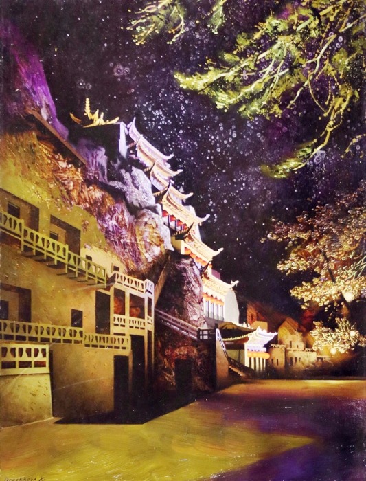 Stars shimmer in the night sky in this oil painting by a Russian artist of the Mogao Grottoes in Dunhuang, Northwest China's Gansu Province. (Photo/chinadaily.com.cn)