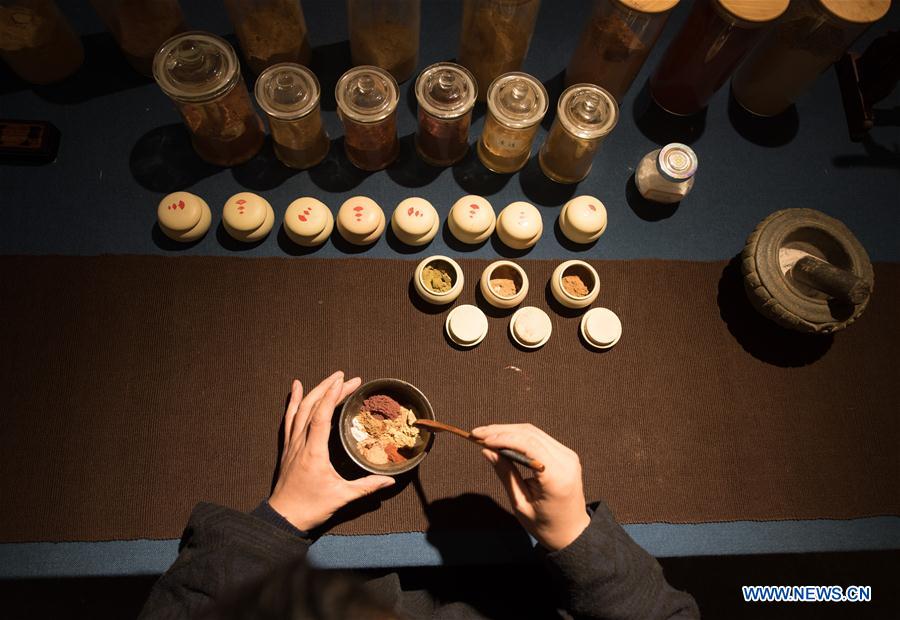 Shu Nan concocts perfumes in a traditional way to make incense in Miaoxi Town of Huzhou, east China's Zhejiang Province, Jan. 8, 2019. Being about 30 years old, Shu Nan is a famous incense maker who has made 50 kinds of incense products now. Shu Nan started to engage traditional incense making when he worked in a museum after graduation. He established his own incense studio in Hangzhou, Zhejiang's capital, in 2013. In 2018, he opened an incense culture exhibition hall in Huzhou. (Xinhua/Weng Xingyang)