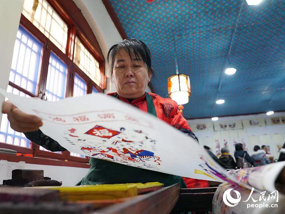 People make handcrafted woodblock New Year paintings in the workshop of Yangjiabu Folk Art Grand View Garden. (Photo/Huangfu Wanli)