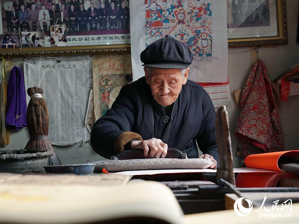 Yang Luoshu, 93, a representative inheritor of the Yangjiabu woodblock New Year paintings. (Photo/Huangfu Wanli)