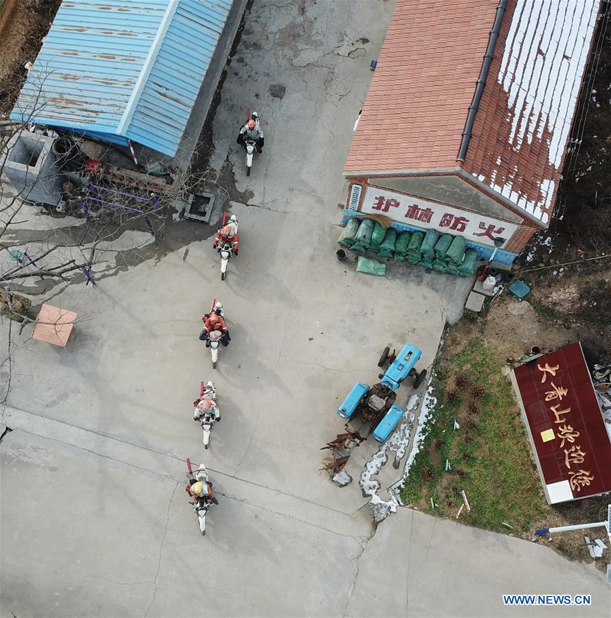 Areial photo taken on Jan. 9, 2019 shows the forest rangers setting off for patrolling at Daqing Mountain provincial forest park in Laixi City, east China's Shandong Province. The team of forest rangers, whose average age is above 40, have worked at Daqing Mountain provincial forest park for many years. There haven't been any wild fire accidents in Daqing Mountain for 15 years under their protection. (Xinhua/Ding Hongfa)