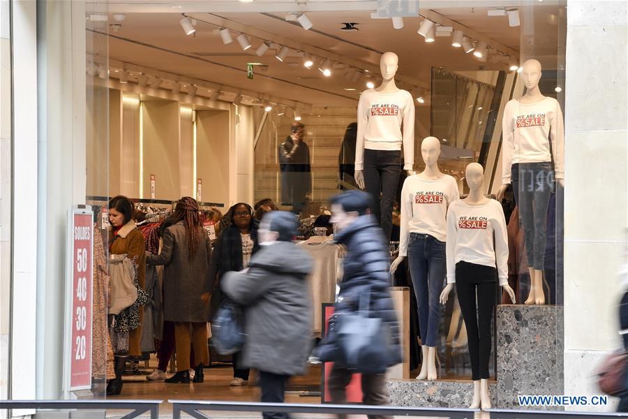 Pedestrians pass by a shop window in Paris, France, on Jan. 10, 2019. The traditional discount season kicked off on Wednesday and will last till Feb. 19. (Xinhua/Jack Chan)