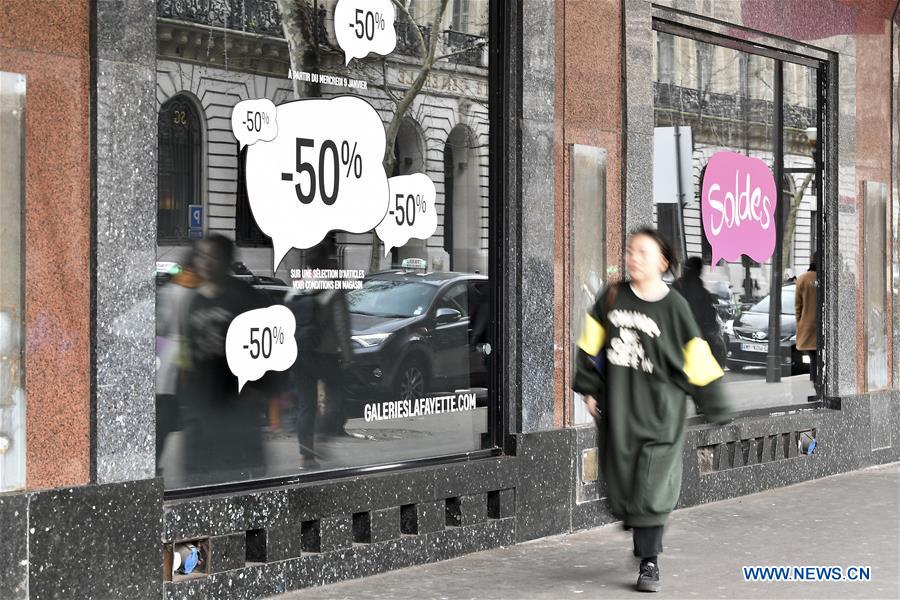 Pedestrian passes by a shop window in Paris, France, on Jan. 10, 2019. The traditional discount season kicked off on Wednesday and will last till Feb. 19. (Xinhua/Jack Chan)