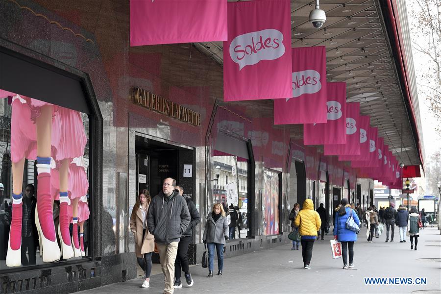 Pedestrians pass by a shop window in Paris, France, on Jan. 10, 2019. The traditional discount season kicked off on Wednesday and will last till Feb. 19. (Xinhua/Jack Chan)