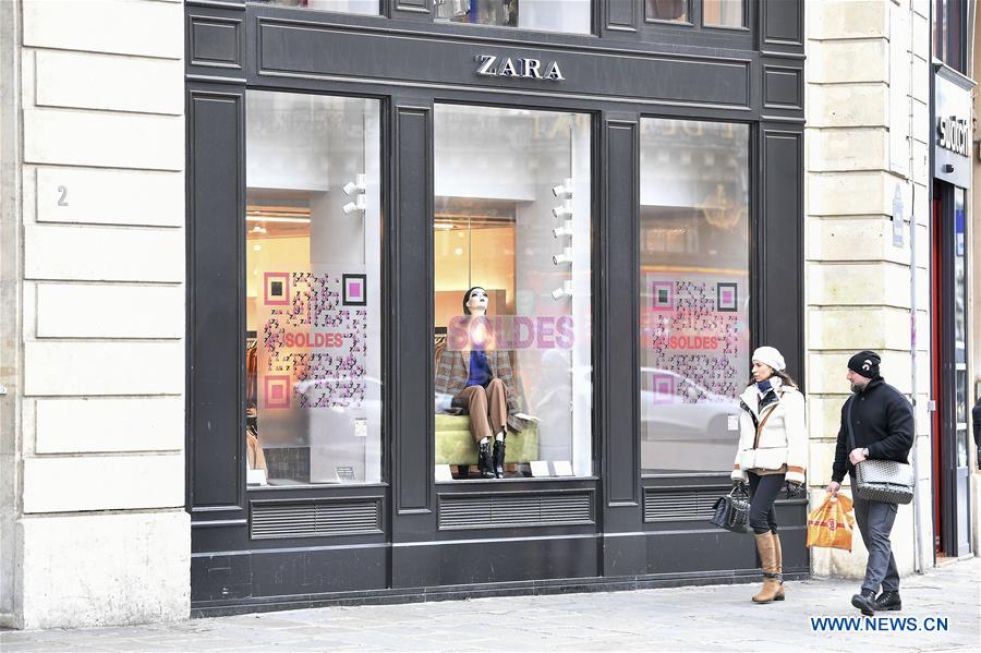 Pedestrians pass by a shop window in Paris, France, on Jan. 10, 2019. The traditional discount season kicked off on Wednesday and will last till Feb. 19. (Xinhua/Jack Chan)