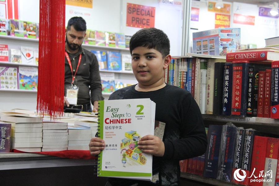 A 9-year-old boy at the Chinese booth finds the book "Easy Steps to Chinese" fascinating. (Photo/Yuan Jirong)