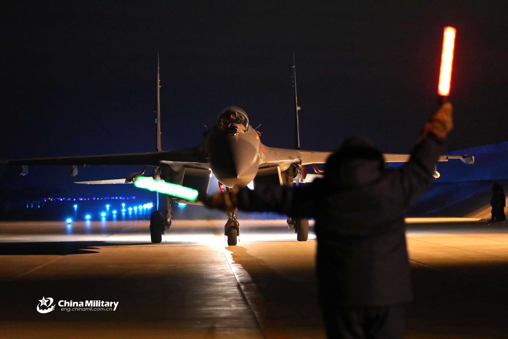 A ground crew assigned to an aviation brigade of the air force under the PLA Southern Theater Command signals a J-11 fighter jet during a recent night flight training exercise. (eng.chinamil.com.cn/Photo by Tang Jun)