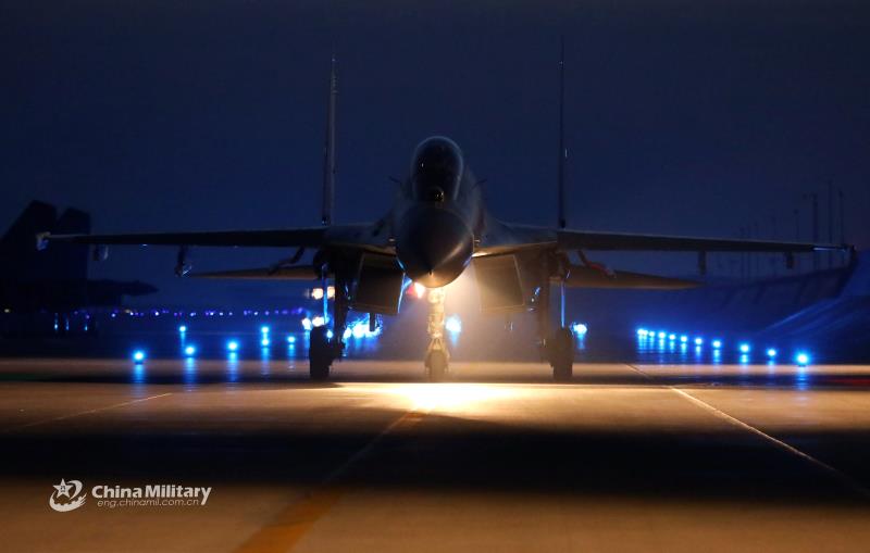 A J-11 fighter jet attached to an aviation brigade of the air force under the PLA Southern Theater Command taxies down the runway after completing a recent night flight training exercise. (eng.chinamil.com.cn/Photo by Tang Jun)