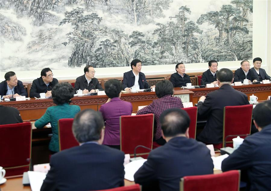 Li Zhanshu, chairman of the National People's Congress (NPC) Standing Committee, presides over a symposium to hear opinions and suggestions on the draft work report of the NPC Standing Committee in Beijing, capital of China, on Jan. 21, 2019. At the symposium, officials from the standing committees of people's congresses of 12 regions, officials from central authorities and NPC deputies spoke highly of the work of 13th NPC and its standing committee so far, and approved the draft work report. (Xinhua/Liu Weibing)