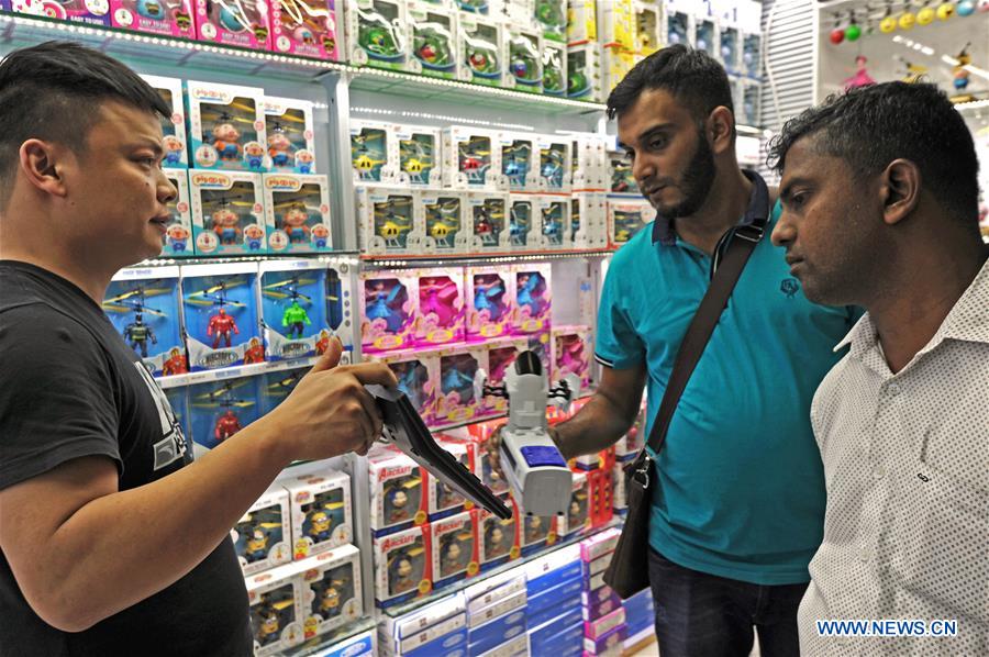 Afghan businessmen bargain with the toy vendor at the Yiwu International Trade City in Yiwu, a city famous for selling small goods in east China's Zhejiang Province, Sept. 13, 2018. Figures released by the Hangzhou Customs showed that the trade volume between Zhejiang and countries along the Belt and Road in 2018 stood at 896.66 billion RMB yuan (132.3 billion U.S. dollars), growing by 12.3 percent year on year, accounting for 31.4 percent of the province's total foreign trade volume and 10.7 percent of China's trade with countries along the Road and Belt. (Xinhua/Tan Jin)
