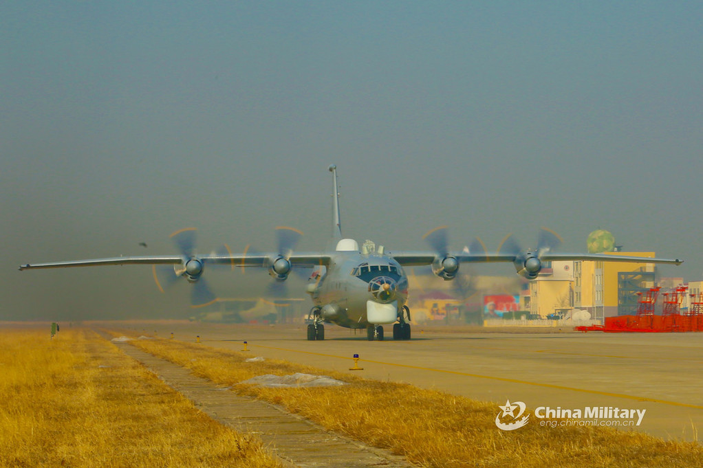 A Y-8 aircraft for special electronic warfare (EW) missions attached to a naval aviation regiment under the PLA Northern Theater Command taxies on the runway in preparation to take off for a round-the-clock flight training exercise in early January, 2019. (eng.chinamil.com.cn/Photo by Xing Yun)