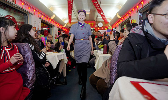 A train attendant models her clothing on a train from Qiqihar, Heilongjiang province, to Beijing on Saturday. Staff members organized a mini Spring Festival gala to entertain passengers, many of them on their way to family reunions. [Photo by Cai Yang/XINHUA]