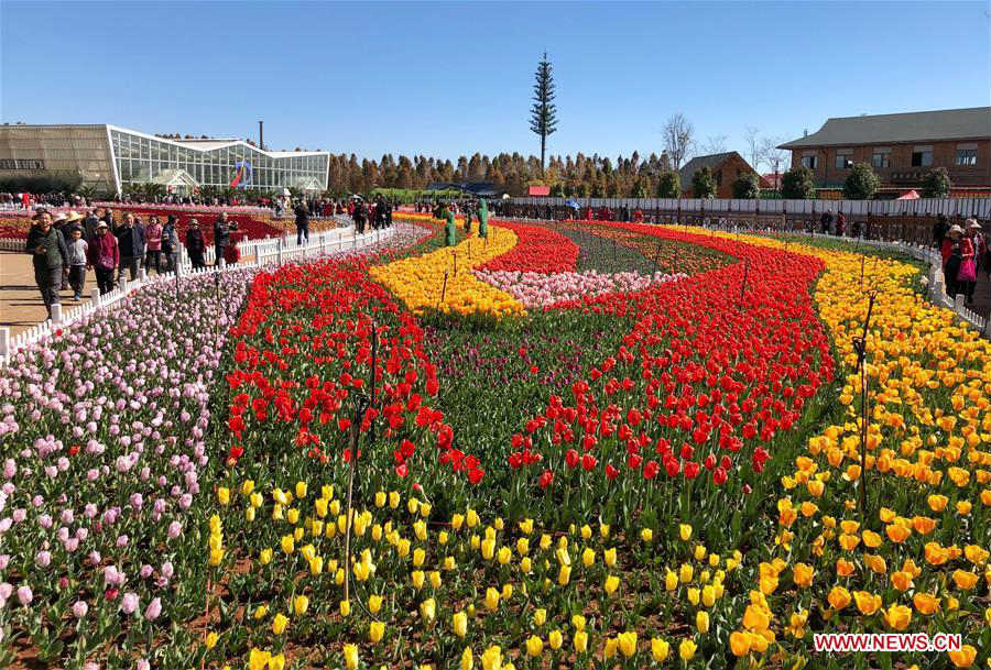 Tourists enjoy tulip flowers at a wetland park in Kunming, southwest China's Yunnan Province, Feb. 6, 2019. Over 50 kinds of tulip flowers are in blossom at the park. (Xinhua/Qin Qing)