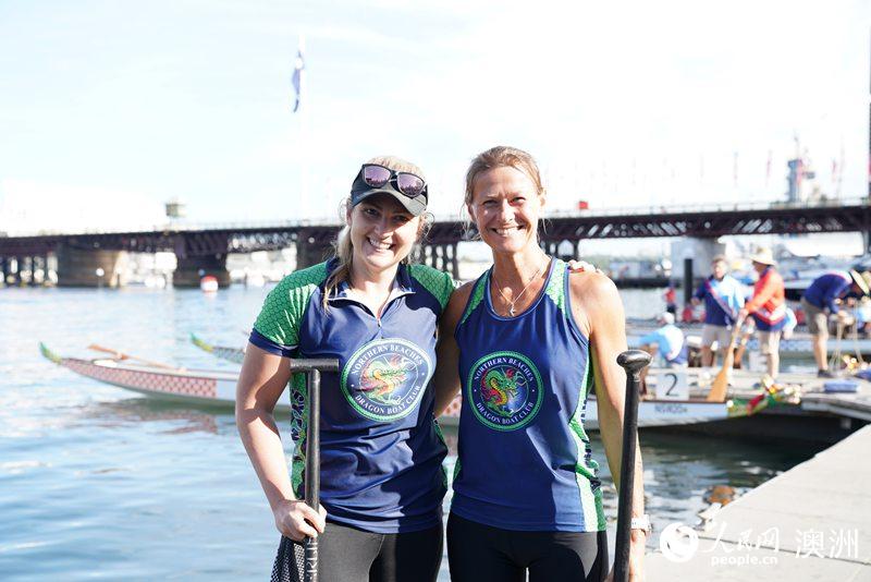Sandra Feustel and her partner from Northern Beaches Dragon Boat Club(People's Daily Online Shengyin Li)