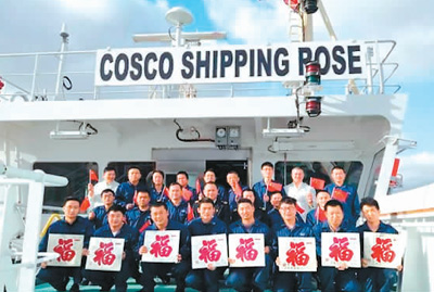Di Wenshun, a sailor with COSCO Shipping Rose, a freight liner of China Ocean Shipping (Group) Company (COSCO), enjoyed a number of celebration activities and a reunion dinner with a dozen colleagues from the Los Angeles branch of COSCO on the ship during the Spring Festival.