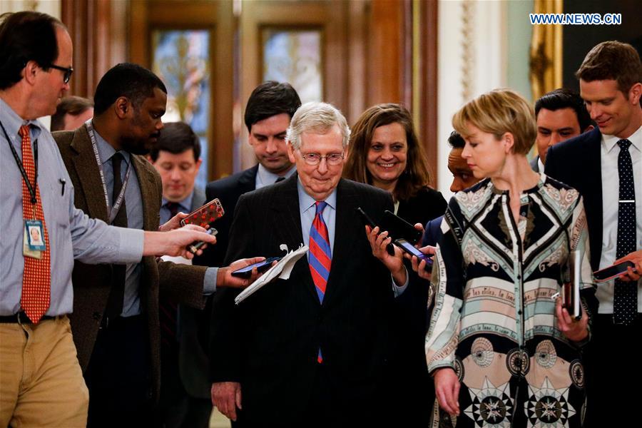 U.S. Senate Majority Leader Mitch McConnell (C) speaks to media in Washington D.C., the United States, on Feb. 14, 2019. U.S. President Donald Trump prepares to sign a bipartisan funding bill to avert another government shutdown, but also declare a national emergency to obtain funds for his long-promised border wall, Mitch McConnell said Thursday. (Xinhua/Ting Shen)