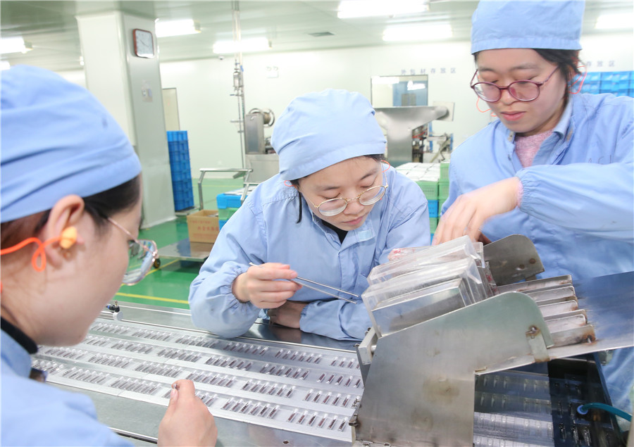Employees check traditional Chinese medicine products at a factory in Nantong, Jiangsu province. [Photo by Xu Congjun/For China Daily]