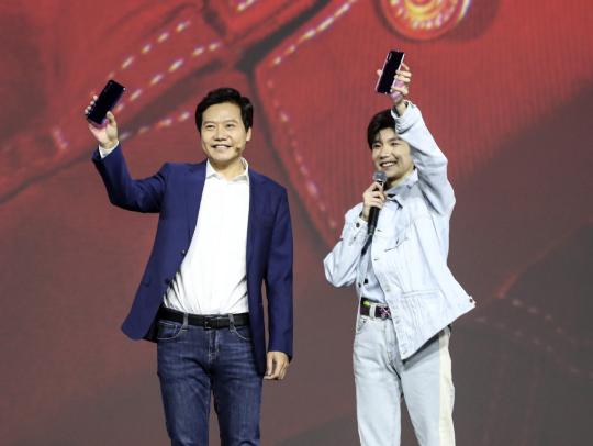 Lei Jun (left), founder and CEO of Xiaomi, attends the launch of the company's new smartphone Mi 9 on Wednesday in Beijing. (Photo by Feng Yongbin/China Daily)