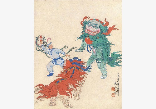 Xu Cao (1899—1961) was a famous character painter born during the Qing Dynasty. He was a skilled painter and specialized in portraits of ladies from ancient times, gongbi style, xieyi style (sketching thoughts), and line drawing (simple and straightforward style). The painting above depicts the dragon-lion dance during the Spring Festival's celebration.