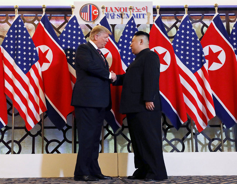 US President Donald Trump and DPRK top leader Kim Jong-un shake hands before their one-on-one chat during the second US-DPRK summit at the Metropole Hotel in Hanoi, Vietnam February 27, 2019. [Photo/Agencies]