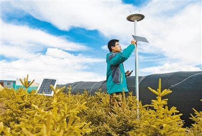 An engineer checks big data automatic monitoring equipment at a weather station in the experimental base of a pilot planting project. Photo by Liu Dongjun from Xinhua News Agency