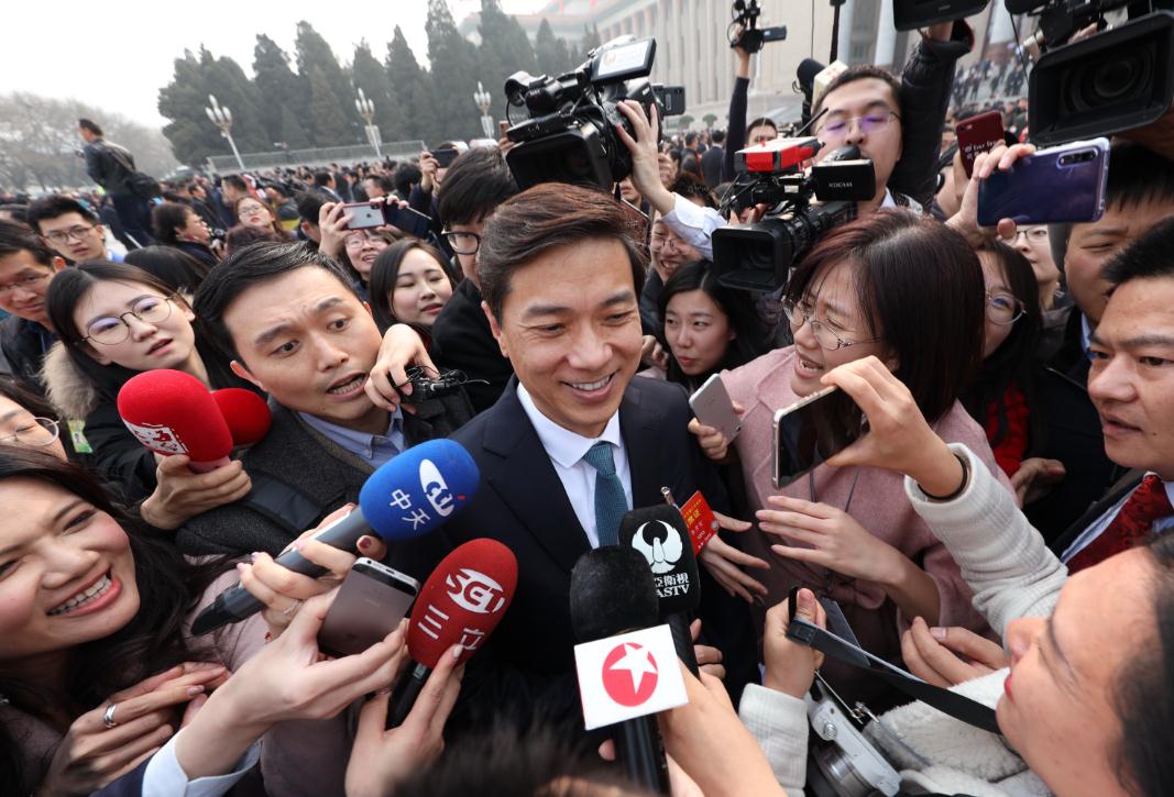 Robin Li, chairman and CEO of leading Chinese search engine Baidu Inc, answers queries outside the Great Hall of the People on March 3. [Photo by Tian He/For China Daily]