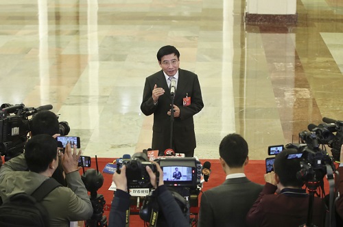 Miao Wei, minister of industry and information technology, is interviewed at the Great Hall of the People in Beijing, March 5, 2019. [Photo/Xinhua]