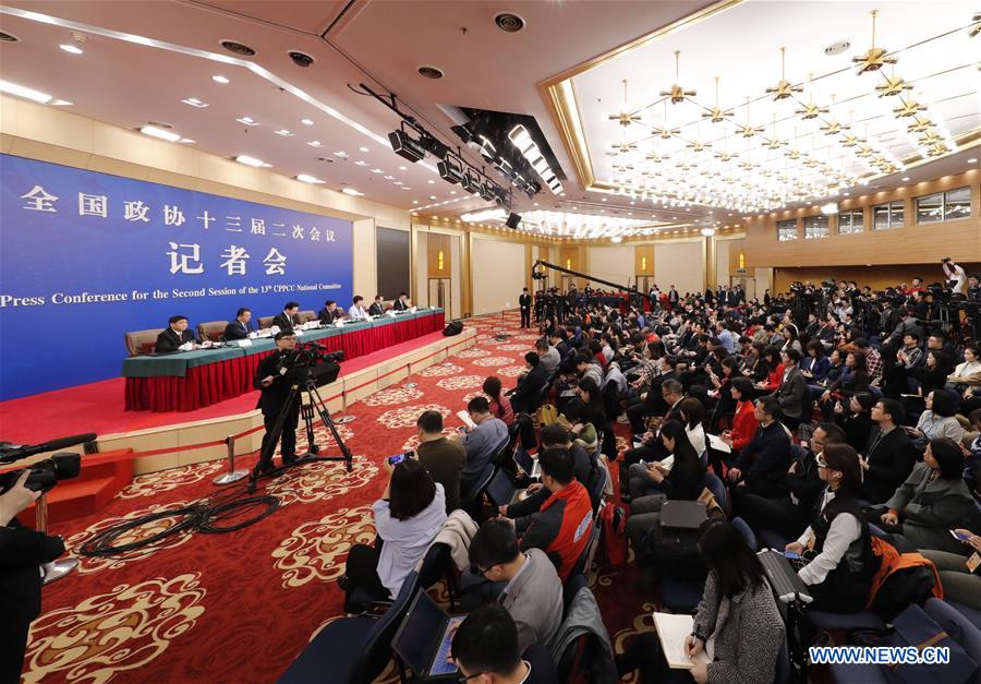 Li Wei, Qin Boyong, Chen Yulu, Wang Peian and Liu Bingjiang, members of the 13th National Committee of the Chinese People's Political Consultative Conference (CPPCC), attend a press conference on winning the three major battles of forestalling and defusing major risks, carrying out targeted poverty alleviation, and preventing and controlling pollution, for the second session of the 13th CPPCC National Committee in Beijing, capital of China, March 5, 2019. (Xinhua/Shen Bohan)