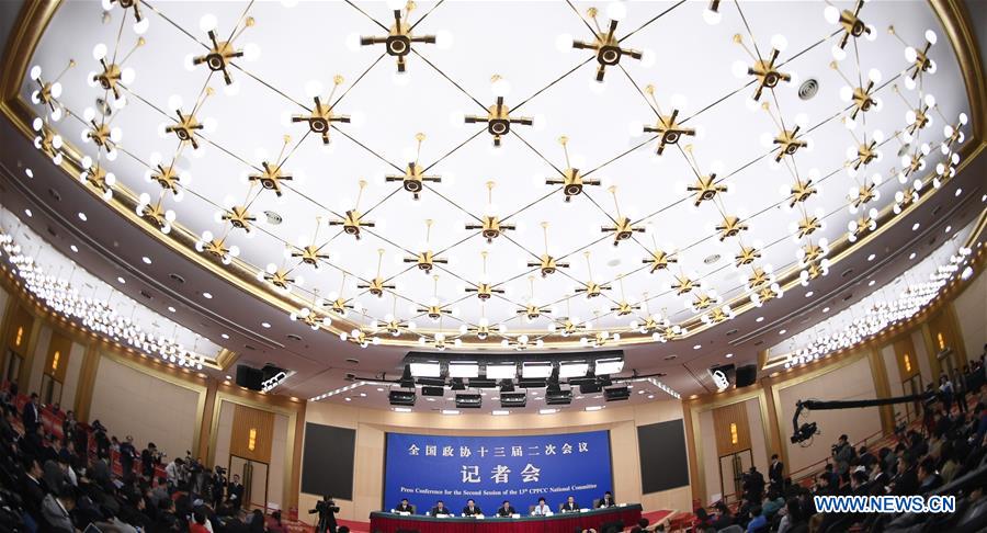 Li Wei, Qin Boyong, Chen Yulu, Wang Peian and Liu Bingjiang, members of the 13th National Committee of the Chinese People's Political Consultative Conference (CPPCC), attend a press conference on winning the three major battles of forestalling and defusing major risks, carrying out targeted poverty alleviation, and preventing and controlling pollution, for the second session of the 13th CPPCC National Committee in Beijing, capital of China, March 5, 2019. (Xinhua/Wang Peng)