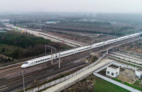 An aerial photo taken on Feb .21, 2019 shows a bullet train leaving Taizhou train station for Nantong, east China’s Jiangsu province. (Photo by Tang Dehong from People’s Daily Online)