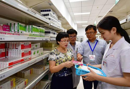 Regulators check the use of drugs included in medical insurance system at a storehouse of an affiliated hospital to Fujian Medical University in southeast China's Fujian province, August 2, 2018. (Photo by People's Daily)