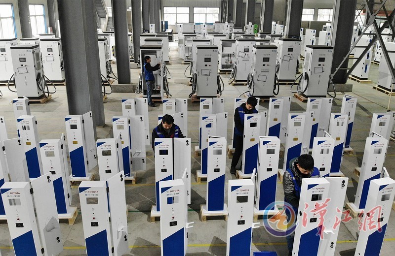 The Surpass Sun Electric Co. Ltd. (SSE) personnel are seen assembling charging piles on February 26.