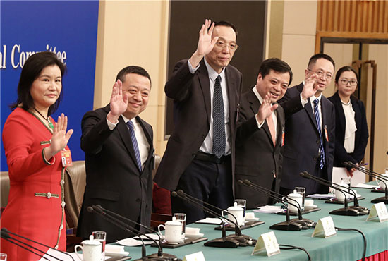From left: Political advisers Zhou Qunfei, Ye Qing, Liu Shijin, Nan Cunhui and Zhou Hongyi wave to journalists at a news conference held during the ongoing session of the 13th National Committee of the Chinese People's Political Consultative Conference in Beijing on Wednesday. ZHU XINGXIN/CHINA DAILY