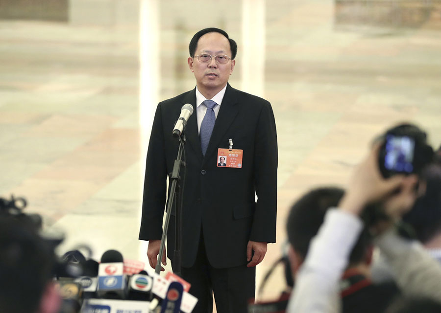 Gou Zhongwen, director of China's General Administration of Sport, receives an interview after the second plenary meeting of the second session of the 13th National People's Congress at the Great Hall of the People in Beijing, capital of China, March 8, 2019. [Photo/Xinhua]