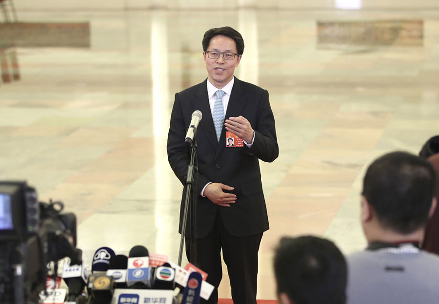 Director of the Hong Kong and Macao Affairs Office of the State Council Zhang Xiaoming receives an interview after the second plenary meeting of the second session of the 13th National People's Congress at the Great Hall of the People in Beijing, capital of China, March 8, 2019. [Photo/Xinhua]