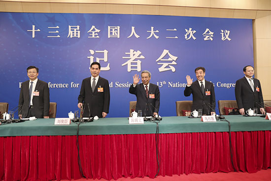 Chen Xiwen (center), chairman of Agriculture and Rural Affairs Committee of the National People's Congress (NPC), Uzhitu (second from right), vice-chairman of Financial and Economic Affairs Committee of the NPC, Liu Junchen (second from left) and Xu Anbiao (first from left), both vice-chairman of Legislative Affairs Commission of the NPC Standing Committee, and Cheng Lifeng, member of the Natural Resource and Environmental Protection Committee of the NPC, attend a press conference on the legislative work of the NPC for the second session of the 13th NPC in Beijing, March 9, 2019.[Photo by Feng Yongbin/chinadaily.com.cn]