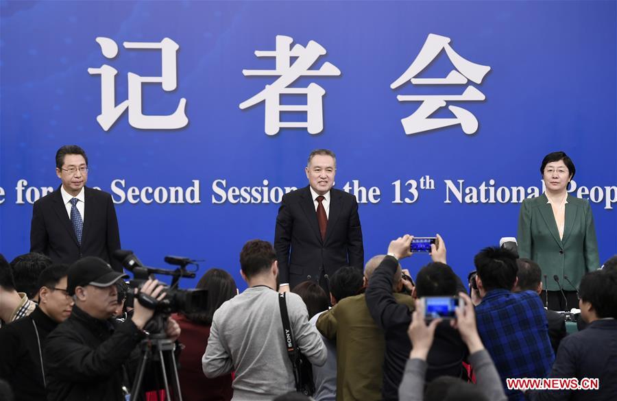 Zhang Mao (C), chief of the State Administration for Market Regulation, Jiao Hong (R), head of the National Medical Products Administration, and Shen Changyu, head of the State Intellectual Property Office, attend a press conference on "strengthening market regulation and maintaining market order" for the second session of the 13th National People's Congress (NPC) in Beijing, capital of China, March 11, 2019. (Xinhua/Wang Peng)