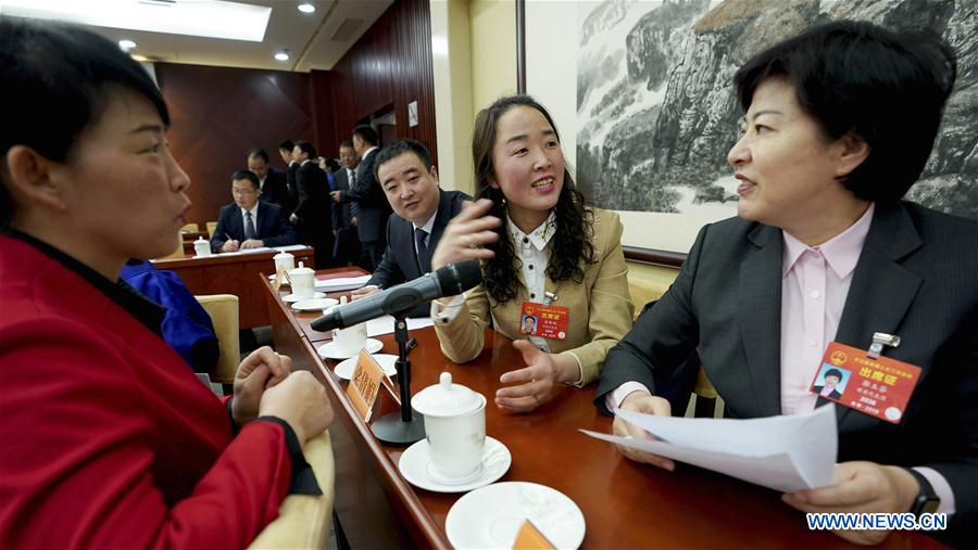 Liang Qianjuan (2nd R) talks with other deputies from Gansu Province in Beijing, capital of China, March 10, 2019. Liang Qianjuan, a deputy to the 13th National People's Congress from Huixian County of northwest China's Gansu Province, called for more efforts to be made to boost training of rural e-commerce personnel and construction of logistics system. She herself was an example of rural e-commerce business. In 2013, she opened an online store and sold the locally produced agricultural products through the Internet, which contributed to local poverty alleviation and changed villagers' lives. (Xinhua/Wang Yuguo)