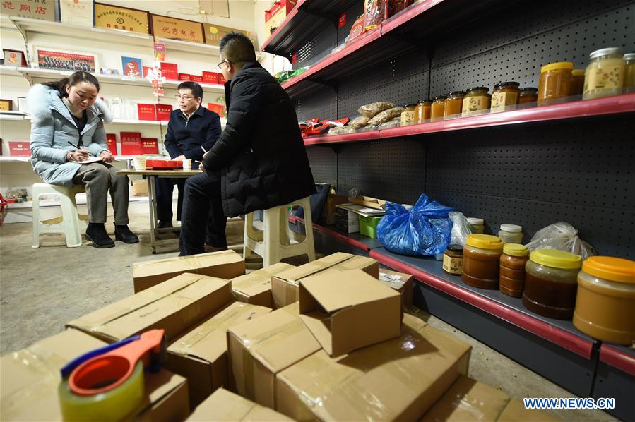 Liang Qianjuan (L) takes notes of ideas about rural e-commerce with local cadres in Shitan Village of Shuiyang Township in Huixian County, northwest China's Gansu Province, Feb. 19, 2019. Liang Qianjuan, a deputy to the 13th National People's Congress from Huixian County of northwest China's Gansu Province, called for more efforts to be made to boost training of rural e-commerce personnel and construction of logistics system. She herself was an example of rural e-commerce business. In 2013, she opened an online store and sold the locally produced agricultural products through the Internet, which contributed to local poverty alleviation and changed villagers' lives. (Xinhua/Fan Peishen)
