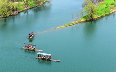 People go sightseeing on bamboo rafts at the Yueliangwan scenic spot in Wuyuan county, east China’s Jiangxi Province, March 10, 2019. (Photo by Hu Dunhuang from People’s Daily Online)