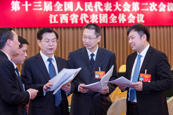 Deputies to the 13th National People's Congress (NPC) from east China's Jiangxi province, including secretary of the Communist Party of China (CPC) Ruijin Municipal Committee Xu Rui (1st from the right), general manager of China Railway Nanchang Group Ma Yejiang (middle) and mayor of Ganzhou city Zeng Wenming (1st from the left), are discussing on the draft of the foreign investment law. Deputies from Jiangxi province held a plenary meeting on March 10 to review the draft. (Photo by Shi Jiamin from People’s Daily)