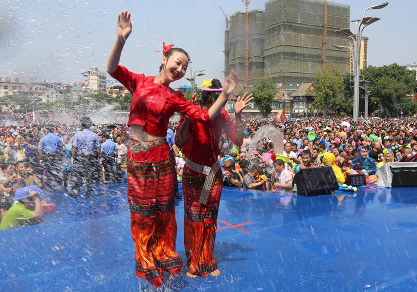 People celebrate the Water-Splashing Festival at a square in Jinghong, southwest China’s Yunnan province, April 15, 2018. (Photo/People’s Daily Online)