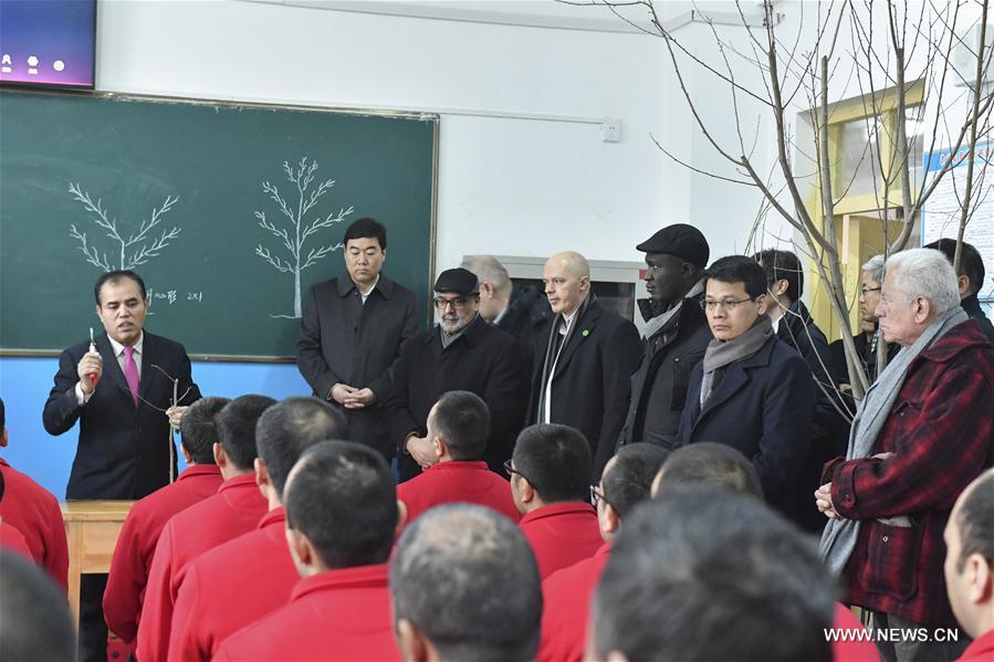 Delegates from permanent missions of eight countries to the United Nations Office at Geneva visit a planting and farming class at the vocational education and training center in Moyu County of Hotan Prefecture, northwest China's Xinjiang Uygur Autonomous Region, Feb. 18, 2019. (Xinhua/Ma Kai)